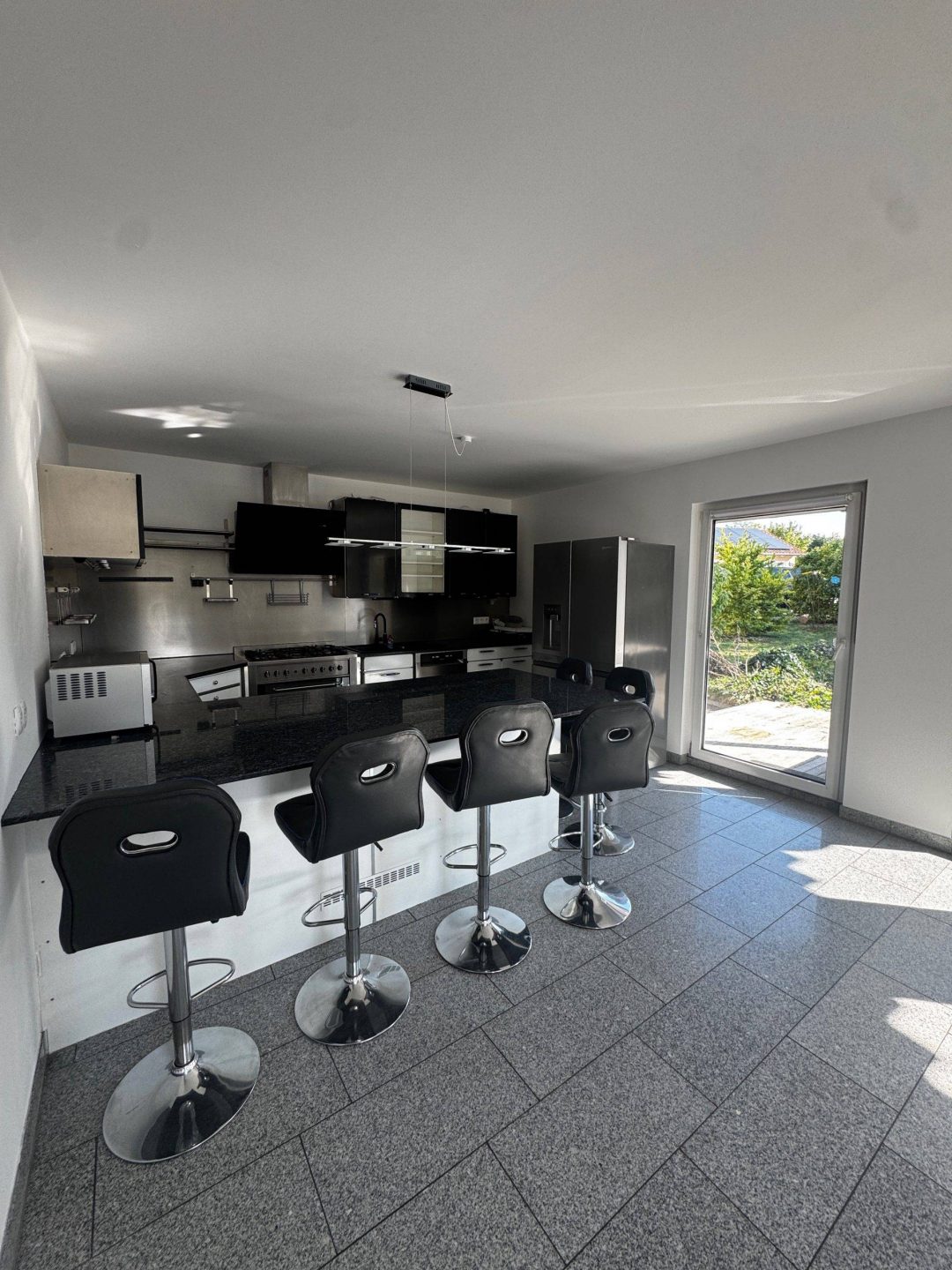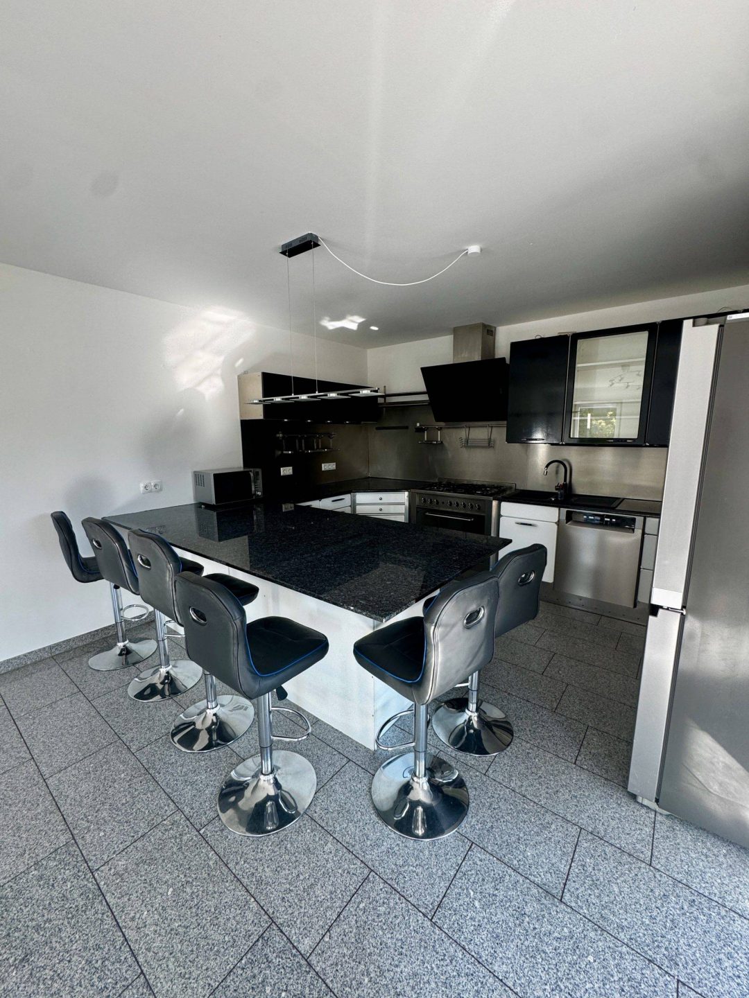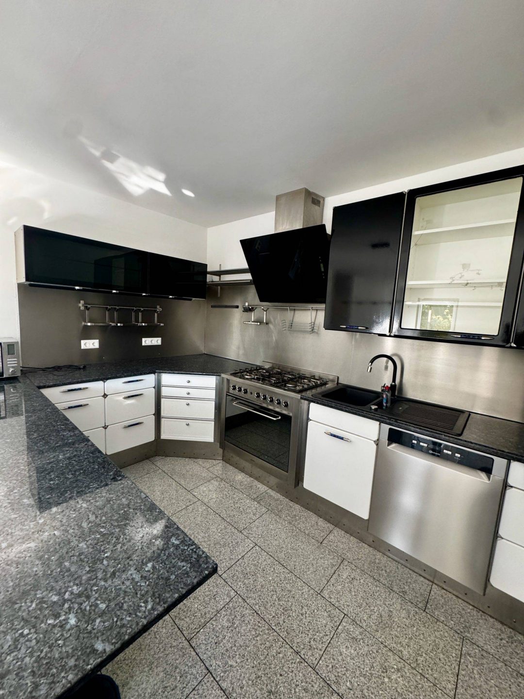 Ein besonderes Highlight ist die großzügige, hochwertige Einbauküche – ein Traum für ambitionierte Köche: Kochen auf der Gasflamme, ein überbreiter Backofen, ein Side-by-Side-Kühlschrank, Geschirrspüler und Dunstabzugshaube bieten alles, was man zum genussvollen Kochen braucht. Der integrierte Essplatz macht die Küche zum kommunikativen Mittelpunkt des Wohnens.