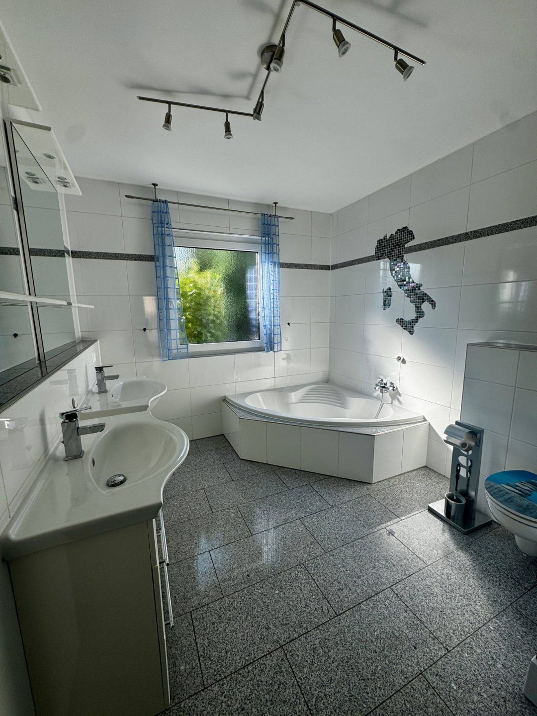 Großzügiges Badezimmer mit luxuriöse großer Dusche, Eck-Badewanne und Doppelwaschbecken sowie einem großen Fenster