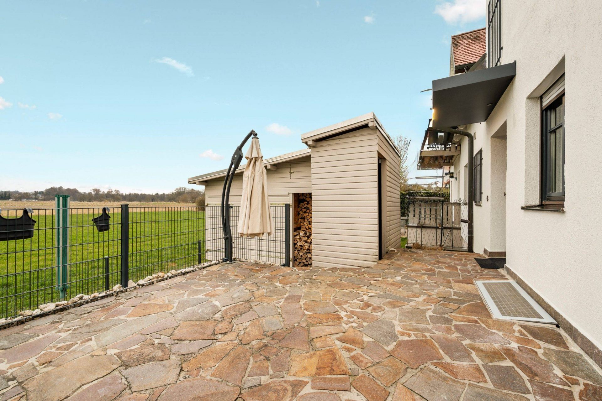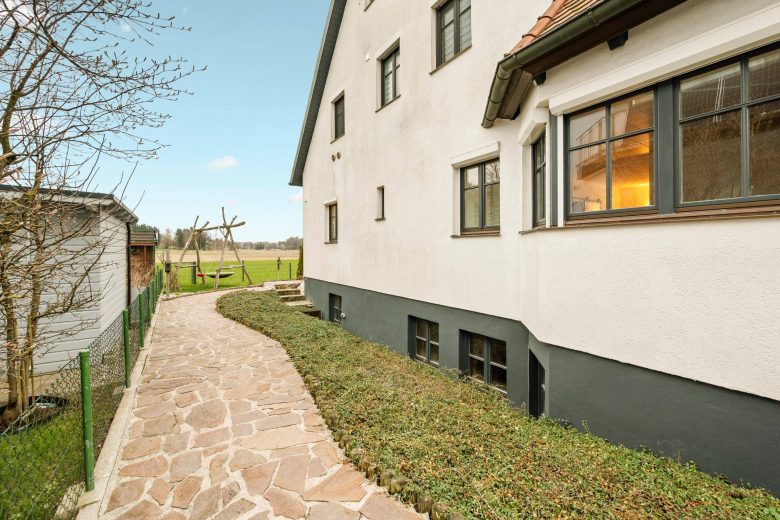Geht man um das Haus herum Richtung Eingang, eröffnet sich ein Ausblick, der einen förmlich umhaut: Der freie Blick über die angrenzenden Felder reicht bis nach Dachau und sogar bis zum Dachauer Schloss. Eine Holzschaukel sowie zwei 2019 neu errichtete Garten- und Holzschuppen – einer als Geräte- und Fahrradschuppen, der andere zur Lagerung von Feuerholz – ergänzen das Außenensemble.