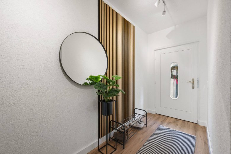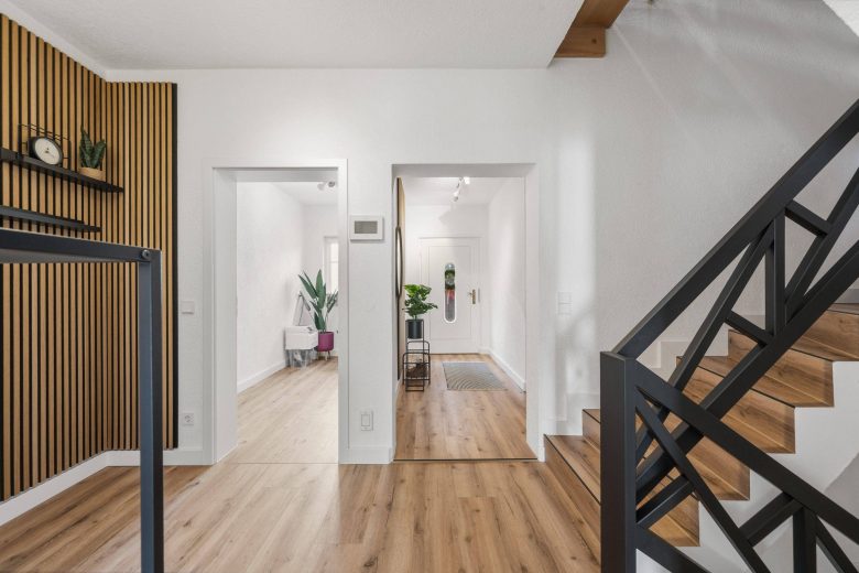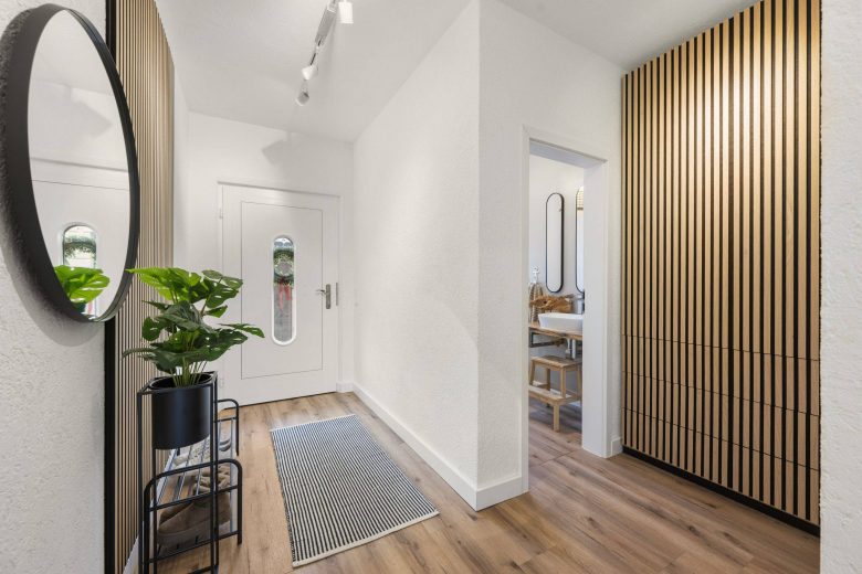 Der Eingangsbereich empfängt hell und stilvoll modernisiert. Ein maßgefertigter, elegant integrierter Garderobenschrank sowie das 2018 komplett sanierte Gäste-WC mit Fenster unterstreichen den hochwertigen Eindruck.