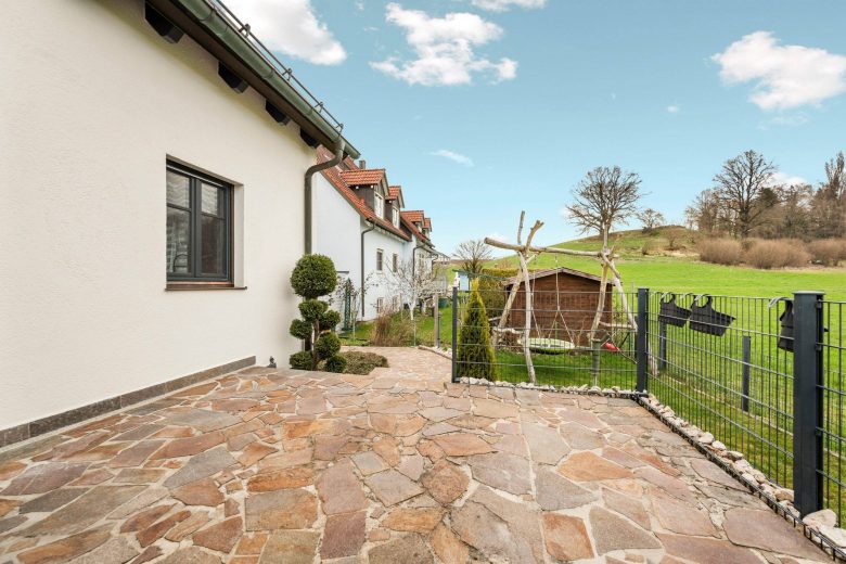 Sanierte Natursteinplatten am Gartenweg (2023) und vor der Garage sowie auf der Terrasse