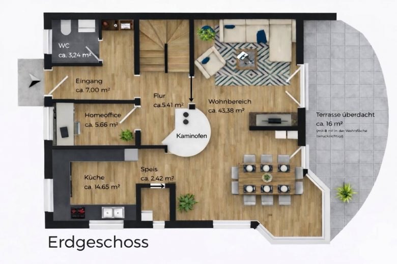 Wohnfläche: ca. 215 m² Wohnfläche (inkl. Terrasse zu 1/2) zzgl. Souterrain-Hobbyraum im Kellergeschoss (außen angeböscht und mit großem Fenster)