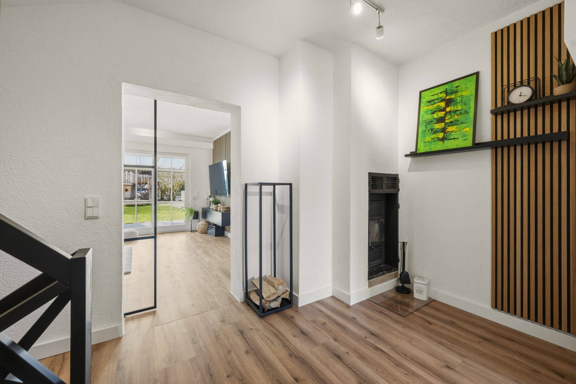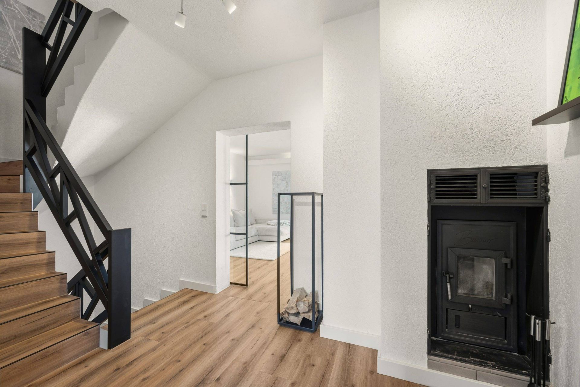 Im gesamten Erdgeschoss, Obergeschoss sowie anteilig im Keller wurde 2024 ein hochwertiger High-Pressure-Laminatboden in Eichenoptik (Industriequalität) mit Trittschalldämmung verlegt. Sämtliche Fenster wurden neu lackiert (innen weiß, außen anthrazit), alle Fenster- und Türdichtungen vollständig erneuert. Besonders hervorzuheben ist das individuell angefertigte schwarze Massivholzgeländer, das vom Erdgeschoss ins Obergeschoss führt – modern, außergewöhnlich und ein echter Blickfang.
