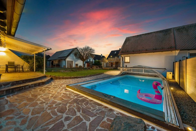 Die überdachte Terrasse mit flexiblem Sonnensegel lädt zu entspannten Stunden ein. Hinter der Garage, sichtgeschützt angelegt, befindet sich der 8,50 x 4 Meter große Pool mit Gegenstromanlage, der bereits 2017 eine aufschiebbare halbrunde Überdachung erhielt und 2023 zusätzlich mit einer Luftwärmepumpe ausgestattet wurde. So ist Badespaß nahezu ganzjährig möglich – im Sommer offen und luftig, in der kühleren Jahreszeit angenehm geschützt.