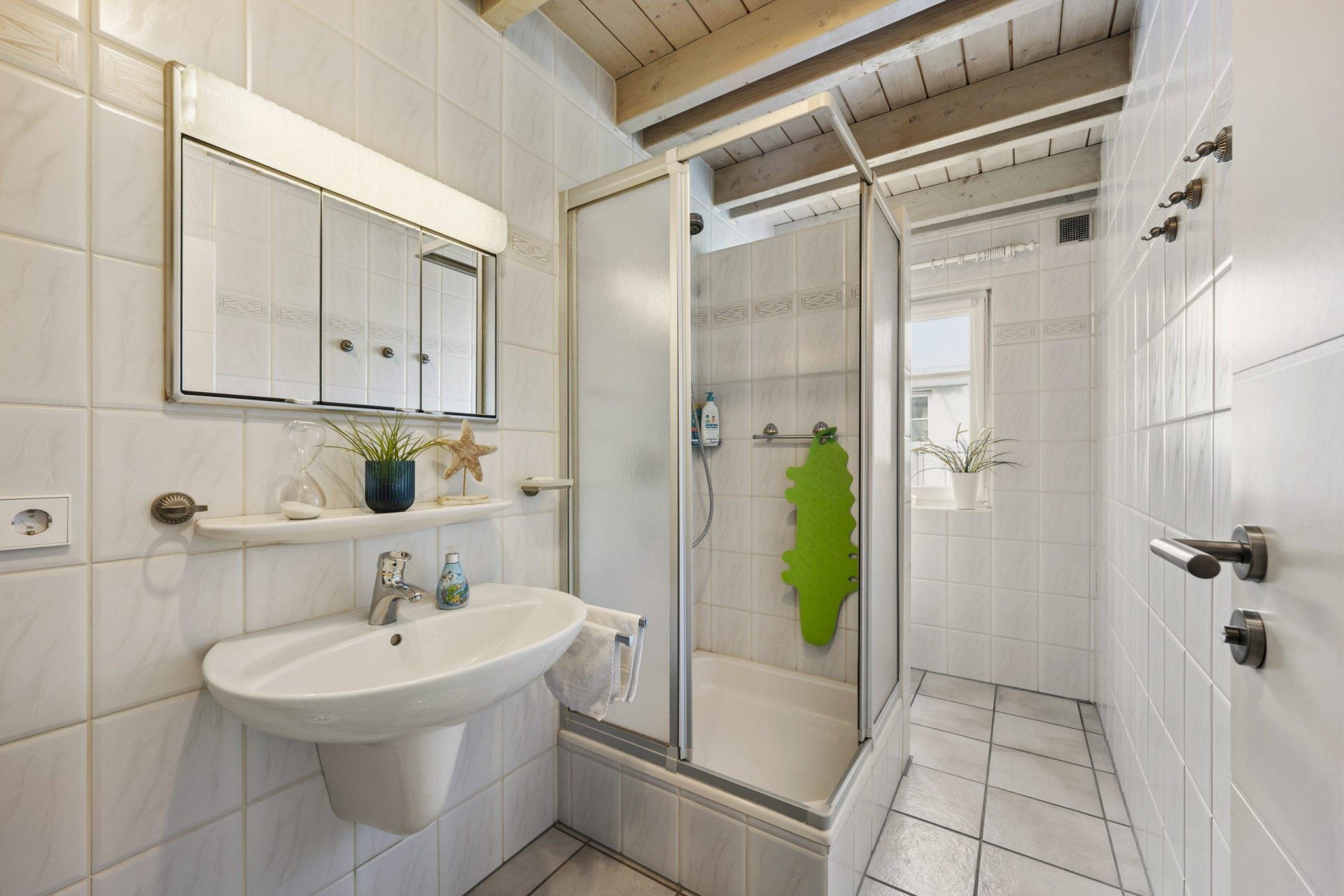 Das Kinderbad nebenan präsentiert sich im gepflegten, zeitlosen Design des Baujahres 1993 – stilistisch im Charme der 90er Jahre gehalten, funktional und sofort nutzbar, mit Potenzial für eine optische Modernisierung nach individuellem Geschmack.