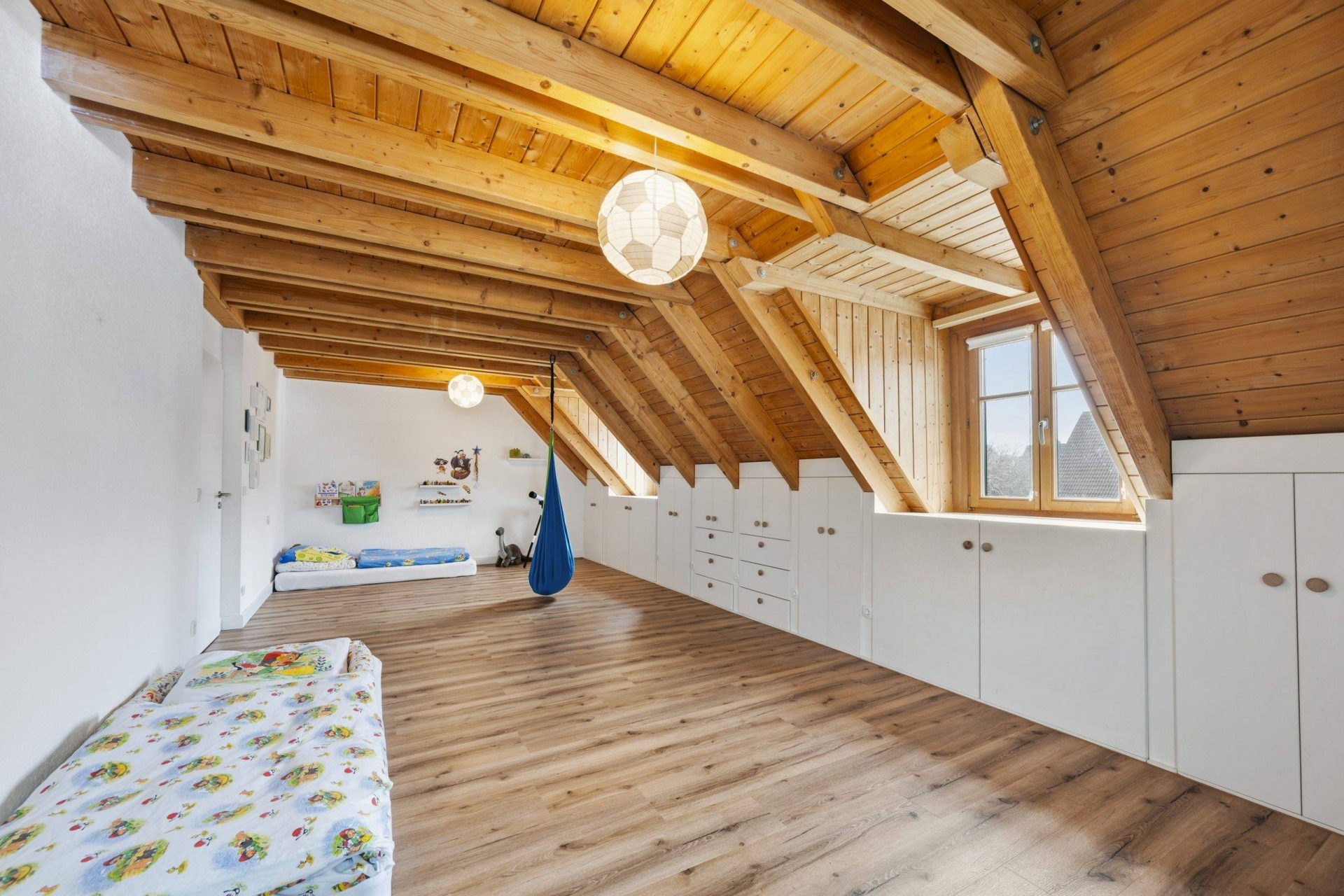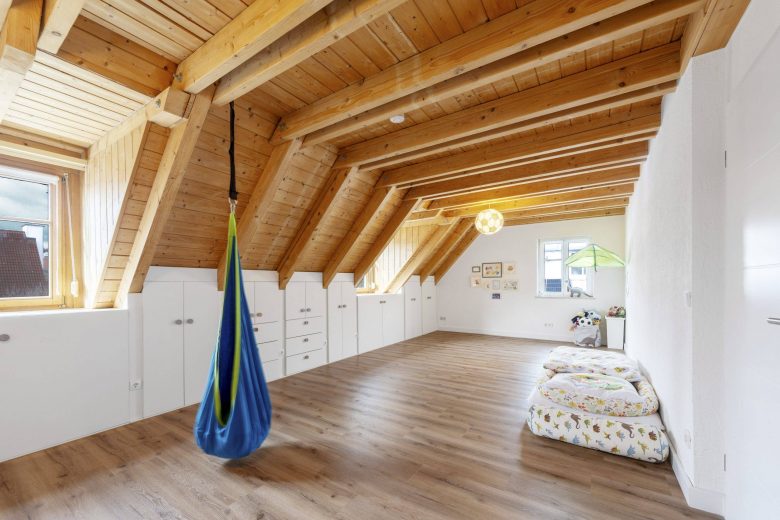 Im Obergeschoss befindet sich ein wunderschönes, außergewöhnlich gemütliches Kinderzimmer mit zwei Gauben und einem zusätzlichen Fenster. Die Dachschrägen und sichtbaren Holzelemente verleihen dem Raum eine warme, behagliche Atmosphäre. Durch die Größe des Zimmers bestünde bei Bedarf sogar die Möglichkeit, zwei separate Räume daraus zu gestalten. Maßgefertigte Einbauschränke in den Dachschrägen bieten dabei viel praktischen Stauraum.