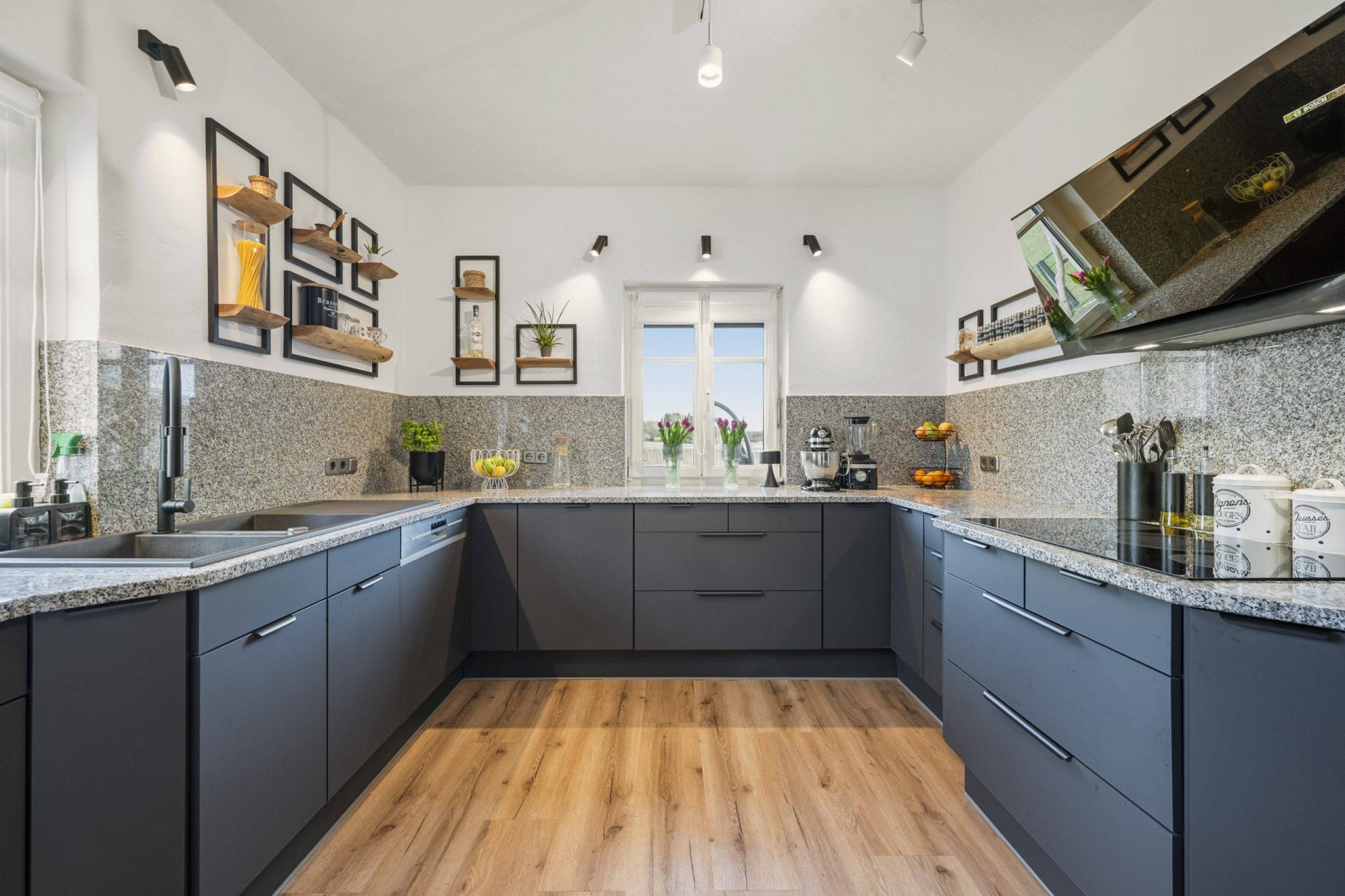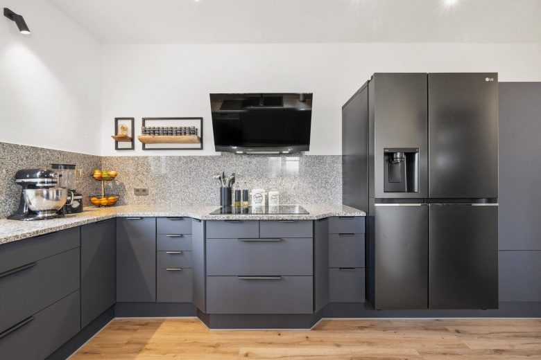 Einbauküche: luxuriöse, modernisierte Einbauküche (2024) mit schicker Granitarbeitsplatte und hochwertigen Einbaugeräten; Anti-Fingerprint Fronten in dunklem anthrazit, side-by-side Kühl-Gefrierschrank mit Wasserspender von LG, Induktionskochfeld, Dunstabzug, Geschirrspülmaschine und Backofen