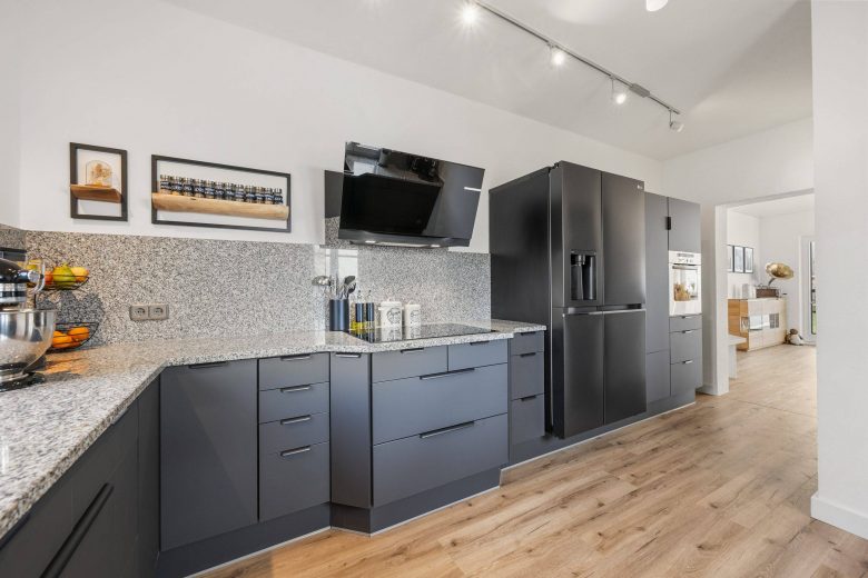 Die besonders großzügige, helle und freundlich gestaltete Küche schließt direkt an den Essbereich an. Sie wurde 2024 umfassend modernisiert, wobei die hochwertigen Schreinerkorpusse aus Vollholz bewusst erhalten wurden. Ergänzt wurde die Küche durch neue Anti-Fingerprint-Fronten in modernem Anthrazit, massive Holzelemente, eine edle Granit-Arbeitsplatte mit passender Rückwand, einen neuen LG Side-by-Side-Kühlschrank mit Eiswürfelfunktion sowie eine Bosch Serie 8 Dunstabzugshaube. Eine separate Speisekammer mit Schiebetür bietet zusätzlichen Stauraum. Hier verbinden sich handwerkliche Qualität und modernes Design auf besonders gelungene Weise.