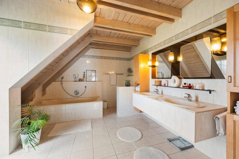 Das Dachgeschoss bietet weiteren Raum für individuelle Nutzungsideen – ob als Büro, zusätzliches Kinderzimmer oder Studio. Auch hier befinden sich ein Badezimmer sowie ein Gäste-WC im Design des Baujahres. Praktische Abseiten sorgen für zusätzlichen Stauraum.