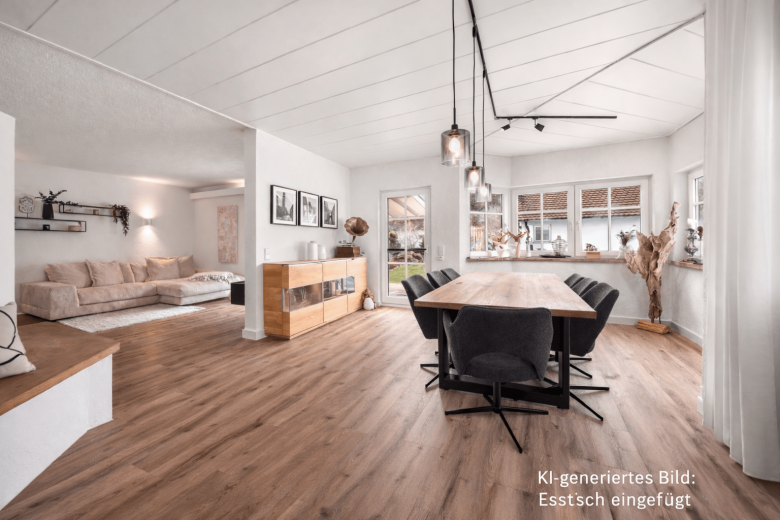Der Wohn- und Essbereich ist weitläufig und zugleich harmonisch strukturiert. Der Bereich mit der großen Wohnlandschaft und der integrierten TV-Wand ist durch einen architektonisch gelungenen Mauervorsprung dezent vom Essbereich abgetrennt. So entstehen zwei miteinander verbundene, aber klar definierte Zonen – perfekt für gemütliche Fernsehabende ebenso wie für gesellige Abende am Esstisch im charmanten Erker.