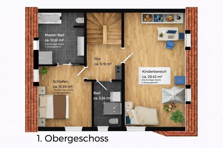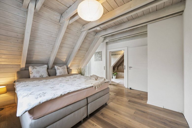 Der Elternbereich überzeugt mit einem großzügigen Schlafzimmer unter den Dachschrägen, das zusätzlich über eine Klimaanlage verfügt und somit auch an heißen Sommertagen für angenehme Temperaturen sorgt.