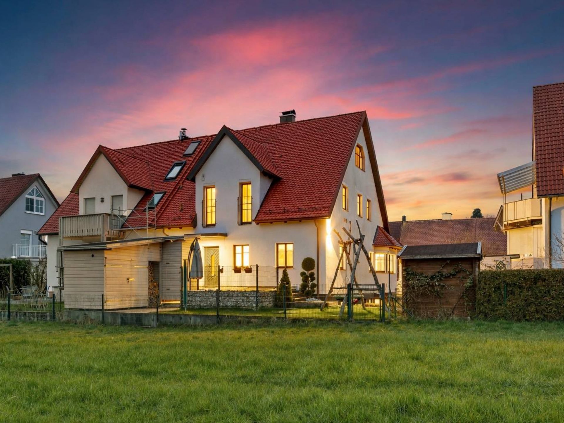 Kaufpreis: 1.329.000 € inkl. neuwertiger Einbauküche, Einbauschränke (z.B. Garderobe, Schränke in der Dachschräge des Kinderzimmers etc.), Kachelofen im Hobbyraum, Klettergerüst und Schaukel
