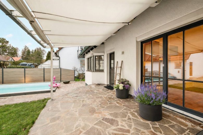 überdachte Terrasse mit Verschattung, belegt mit Natursteinplatten