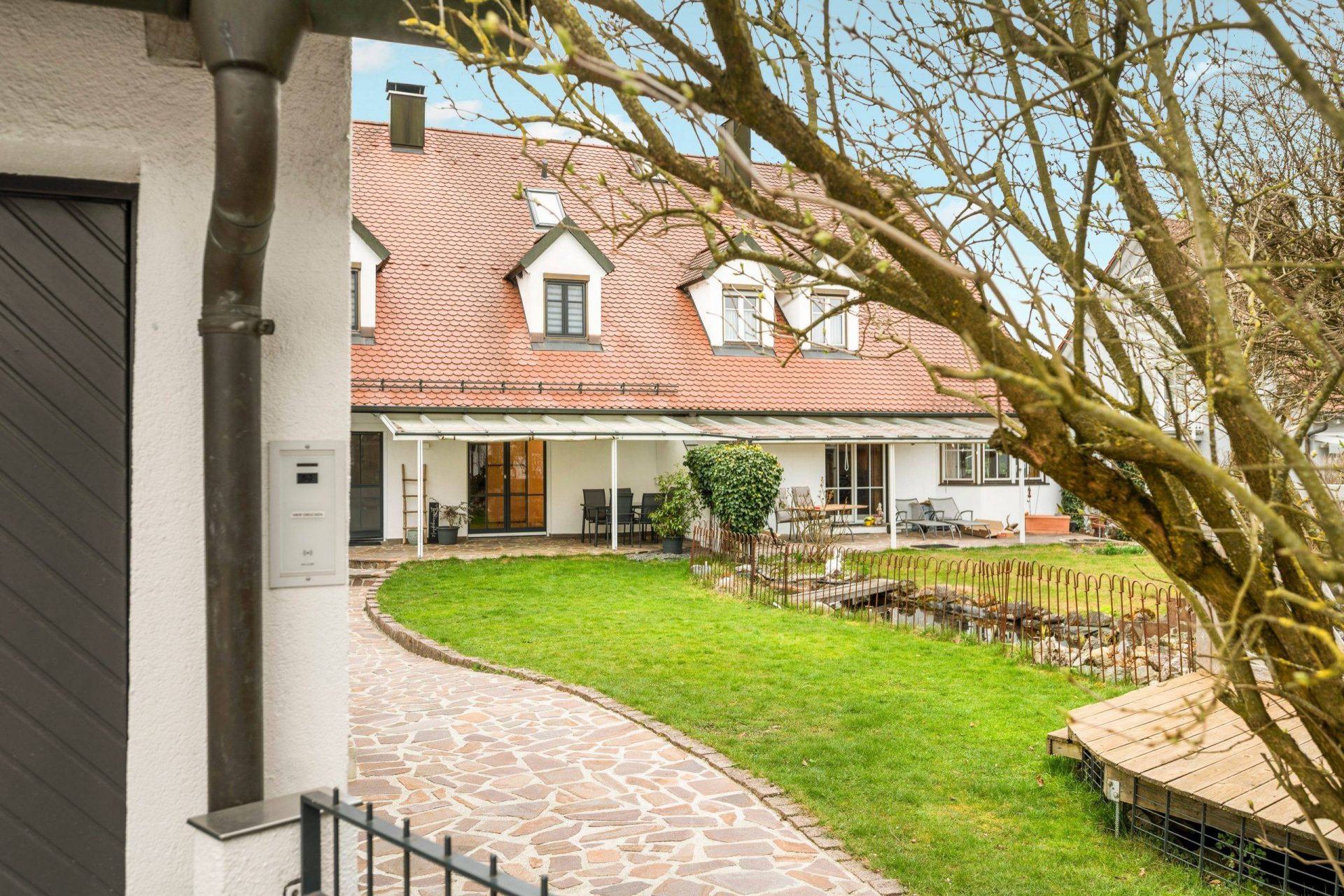 Über die 2023 neu installierte Video-Freisprechanlage mit Kamerafunktion betreten Sie das 2019 neu angelegte Gartengrundstück. Ein großes Holzkletterhaus, das mitverkauft wird, verspricht Spiel und Freude für Kinder. Zwischen den beiden Haushälften liegt ein idyllisch eingewachsener kleiner Teich, der dem Garten eine besondere Atmosphäre verleiht.