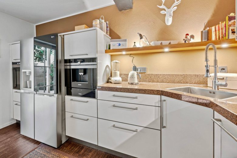 - hochwertige Einbaugeräte wie einen side-by-side Kühl-Gefrierschrank mit Wasserspender von LG, Induktiionskochfeld von Siemens mit 90 cm Breite, Dunstabzug der Firma Gutmann, neue Geschirrspülmaschine von Miele, Wärmeschublade von Siemens, eingebaute Kaffeemaschine von Siemens, Backofen von Siemens