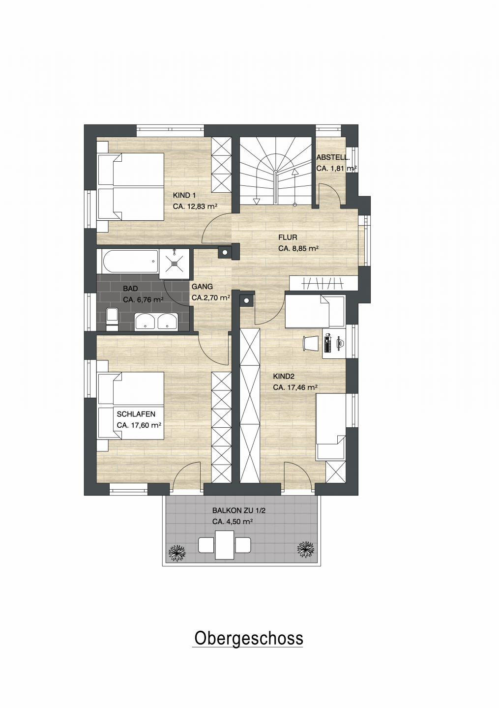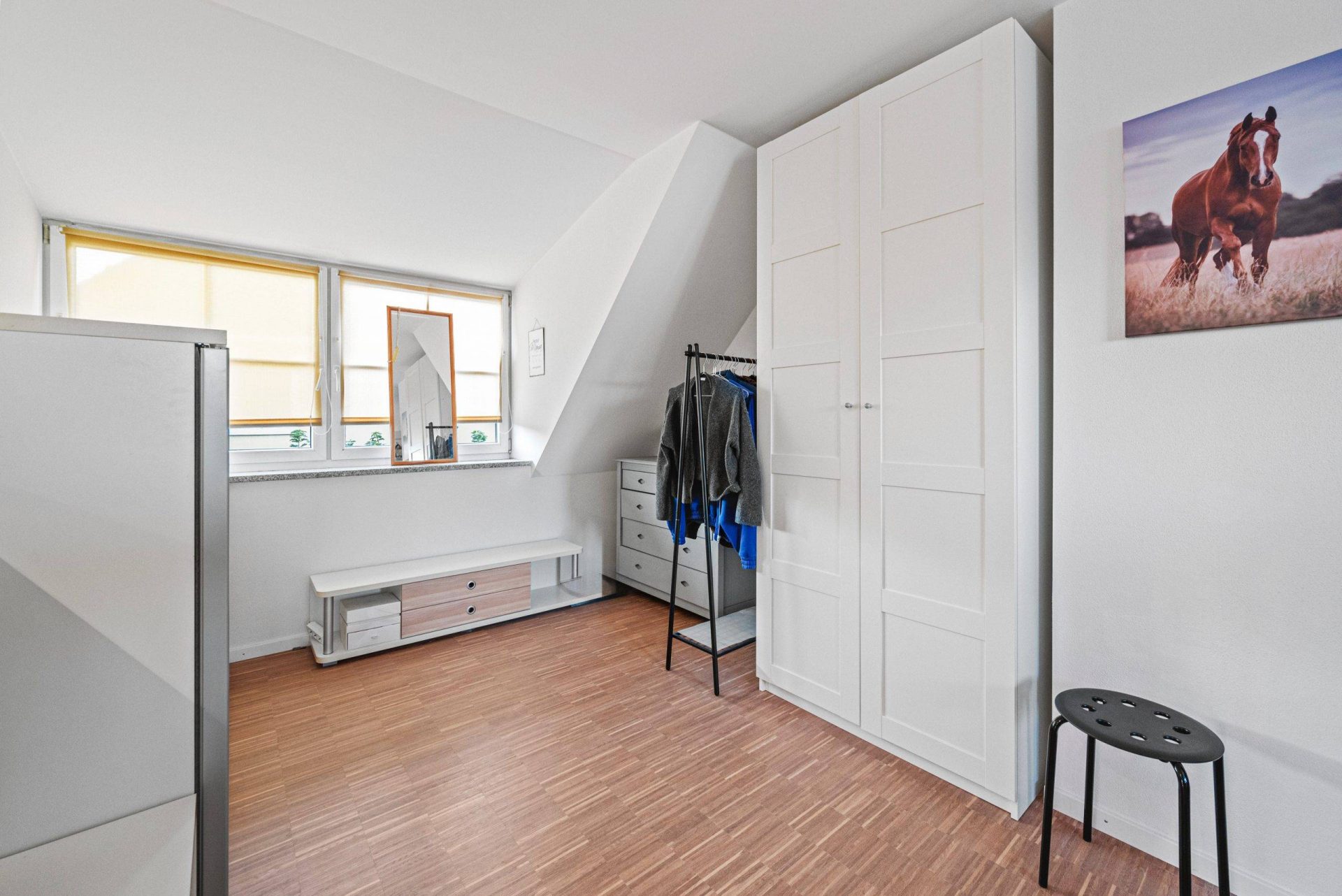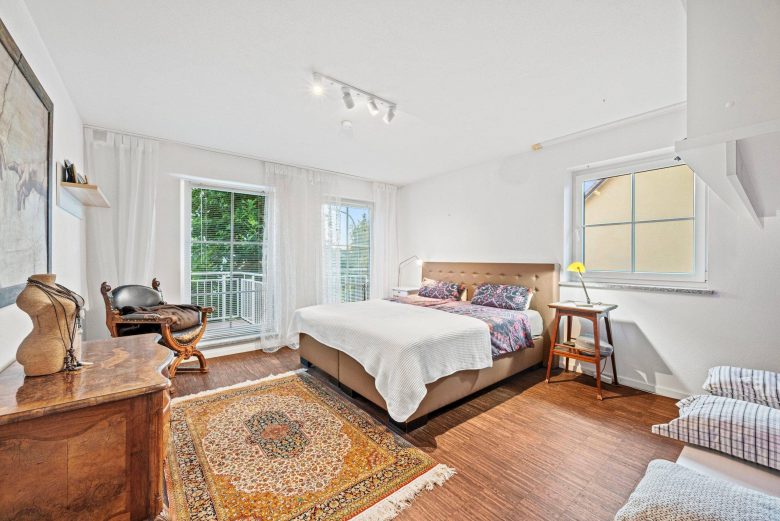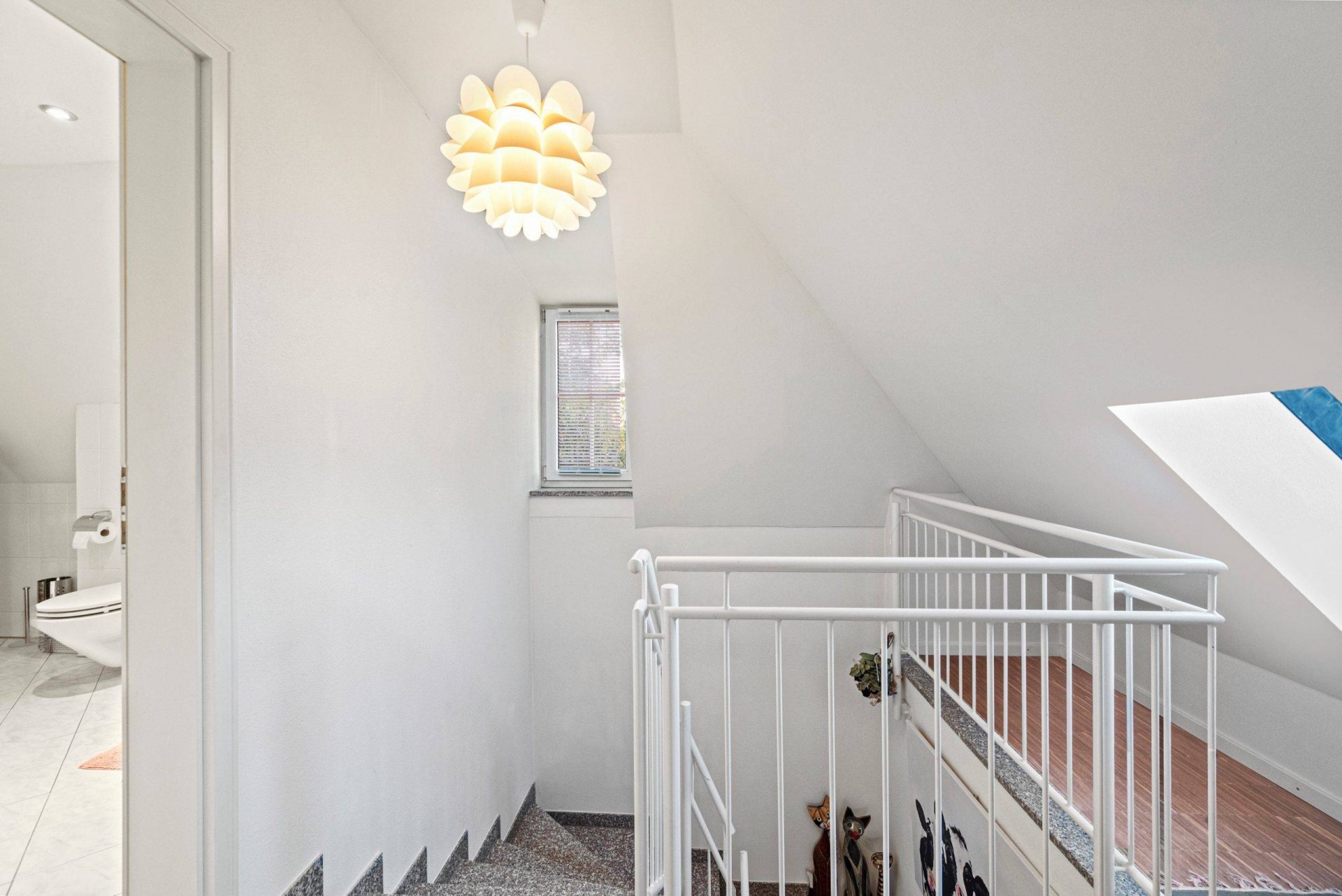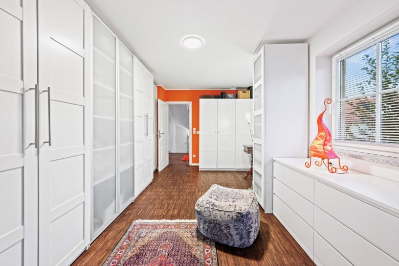Über die Treppe gelangen Sie ins Obergeschoss. Hier bietet ein offener Flurbereich Platz für ein Home-Office oder eine kleine Bibliothek. Neben einem Kinderzimmer und einer Ankleide (auch möglich als Kinderzimmer zu nutzen) finden Sie ein komfortables Schlafzimmer , sowie ein helles Badezimmer mit Dusche, Badewanne, Doppelwaschtisch und großem Fenster. Schlafzimmer und Ankleide/Kind haben Zugang zum Balkon von wo aus sich der Blick in den idyllischen Garten eröffnet– besonders schön in den Abendstunden wenn die Westsonne auf den Balkon scheint.