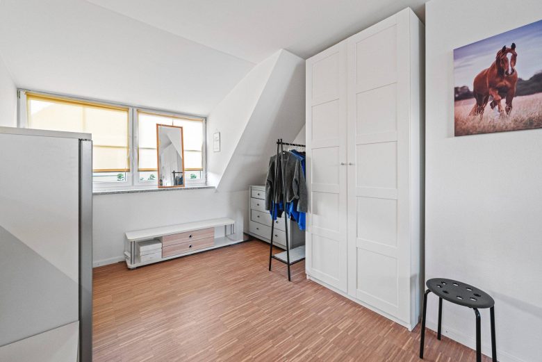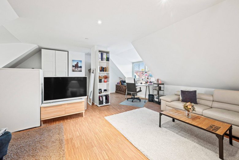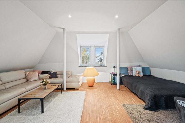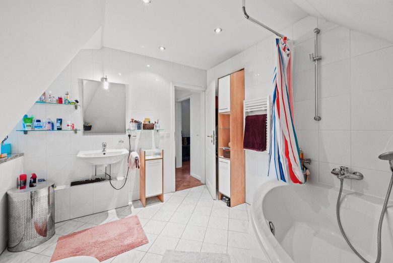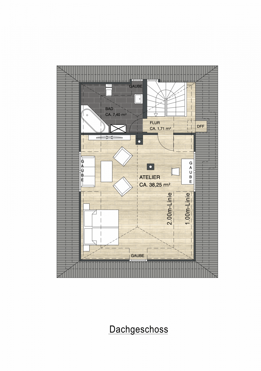 Das Dachgeschoss überzeugt durch das elegante Walmdach mit drei Gauben, die den Räumen eine besonders schöne Atmosphäre verleihen. Ein großzügiger Raum – ideal als Atelier, Jugendbereich oder Elternschlafzimmer mit Ankleide – lässt sich flexibel gestalten. Dazu kommt ein weiteres Bad mit Eckbadewanne, Waschbecken, WC und einem Fenster in der Gaube. Der lichtdurchflutete Flur schafft ein freundliches Wohngefühl.