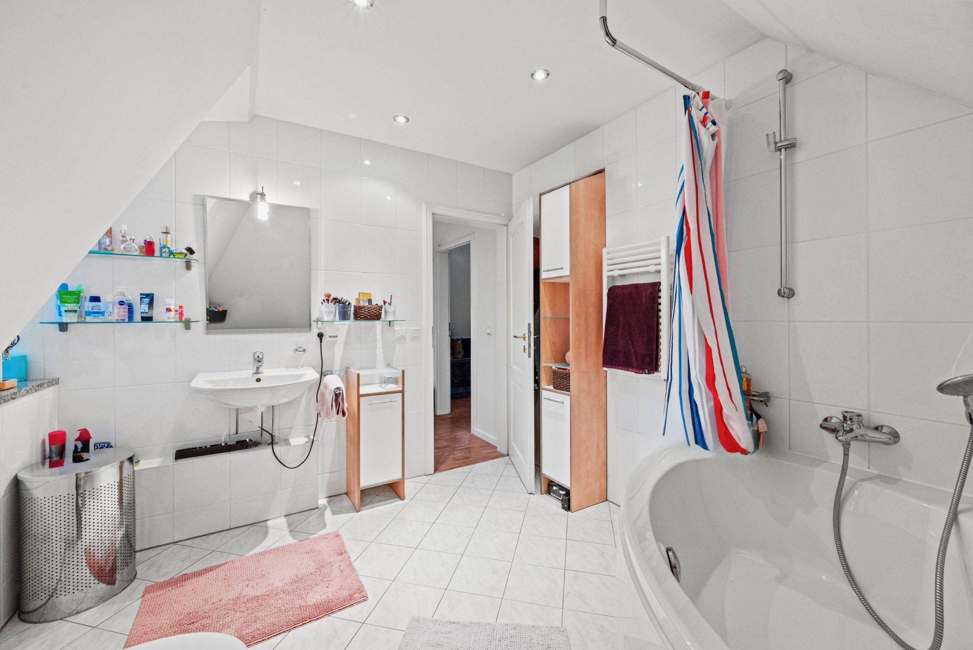 Badezimmer im Dachgeschoss mit großer Eckbadewanne, Fenster, WC und Waschbecken