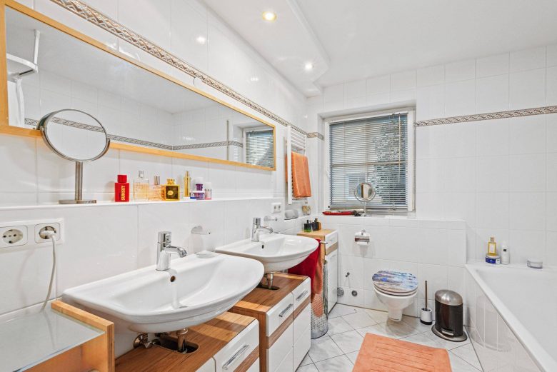 Großzügiges Bad im Obergeschoss mit Dusche, Badewanne, Doppelwaschtisch und großem Fenster