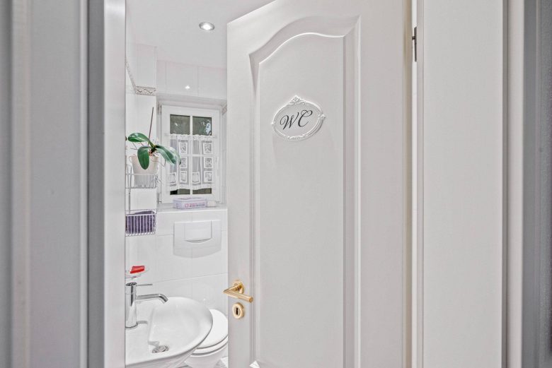 Edles Industrieparkett in dunkel geölter Eiche und weiße Sockelleisten unterstreichen den zeitlosen Charakter. Ein Gäste-WC befindet sich ebenfalls im Erdgeschoss.