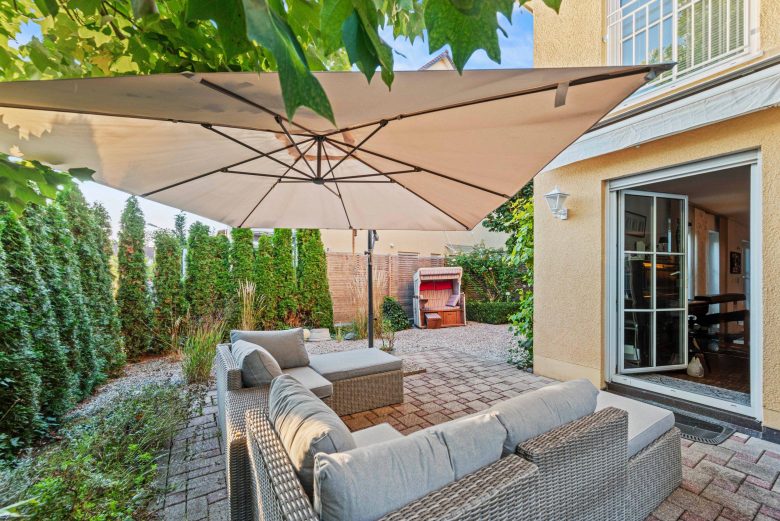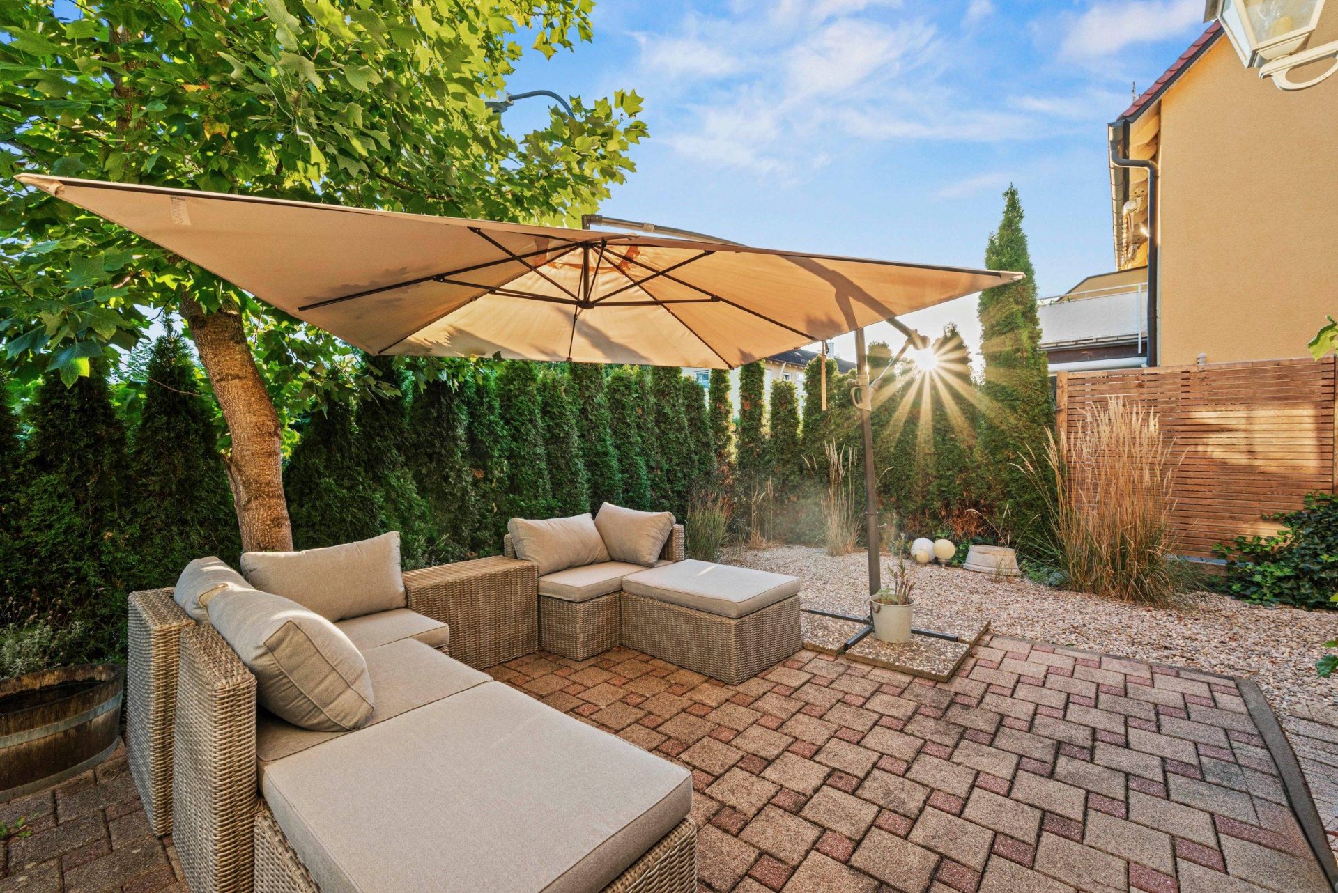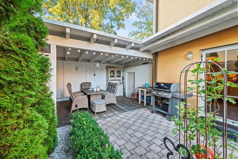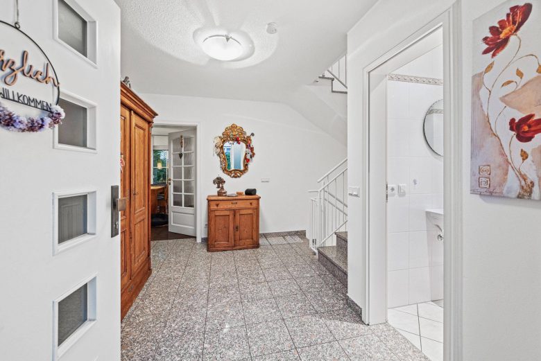 Ein großzügiger Eingangsbereich heißt Sie willkommen und führt direkt in den lichtdurchfluteten ca. 70 m² -großen Wohn- und Essbereich mit offener Küche, die durch eine Kochinsel vom Essbereich abgetrennt ist. Der integrierte Wintergarten erweitert die Fläche harmonisch und schafft fließende Übergänge auf die sonnige Terrasse und in den liebevoll angelegten Garten. Dank der idealen Süd- und Westausrichtung genießen Sie hier den ganzen Tag über Sonne bis in die Abendstunden. Gepflegte, gekieste Flächen fügen sich stilvoll in die Gartenarchitektur ein und sorgen für ein aufgeräumtes, elegantes Gesamtbild. Der überdachte Freisitz bietet einen geschützten Platz für entspannte Sommerabende und führt über eine Hintertür direkt in die angrenzende Garage. Die hochwertige weiße Einbau-Küche mit Granitplatte ist modern ausgestattet und leicht erhöht – besonders praktisch für große Menschen. Ein Barbereich aus Eichenholz wurde von einem Schreiner vor die Kücheninsel gesetzt.