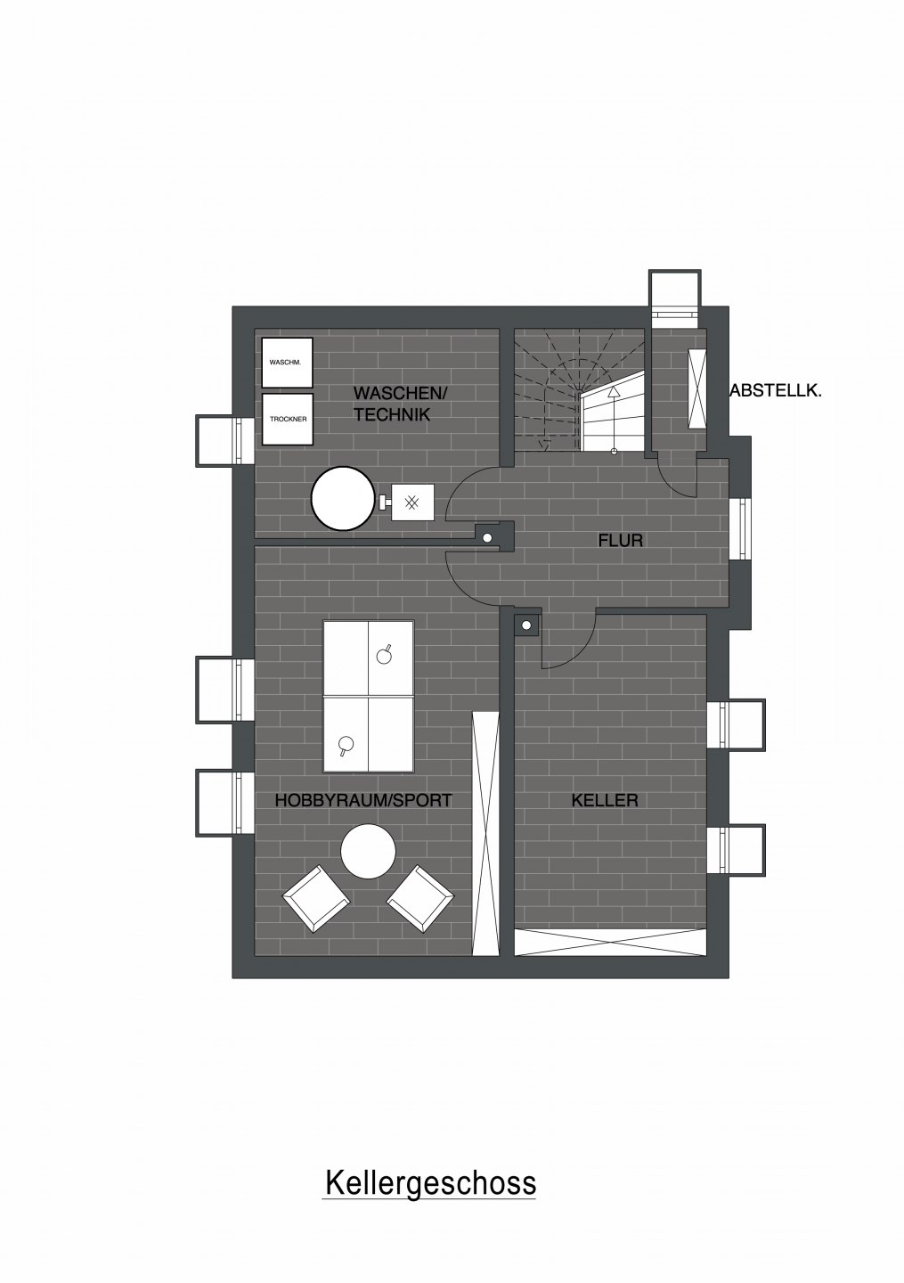 Im Keller befinden sich neben Heizungs- und Hauswirtschaftsräumen (mit Platz für Waschmaschine und Trockner) ein beheizbarer Hobbyraum, ein großer Abstellraum und weitere Nutzflächen. Die Haustechnik ist auf dem neuesten Stand: moderne Heizungsanlage mit 300-Liter-Pufferspeicher, PV-Anlage mit 19 Modulen, Batteriespeicher (3 x 2,56 kWh) sowie Wallbox in der Garage.