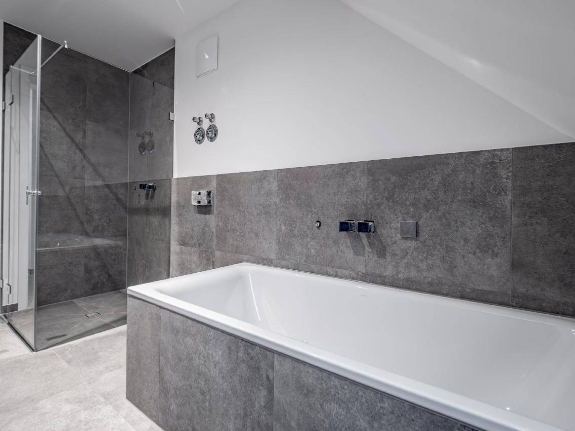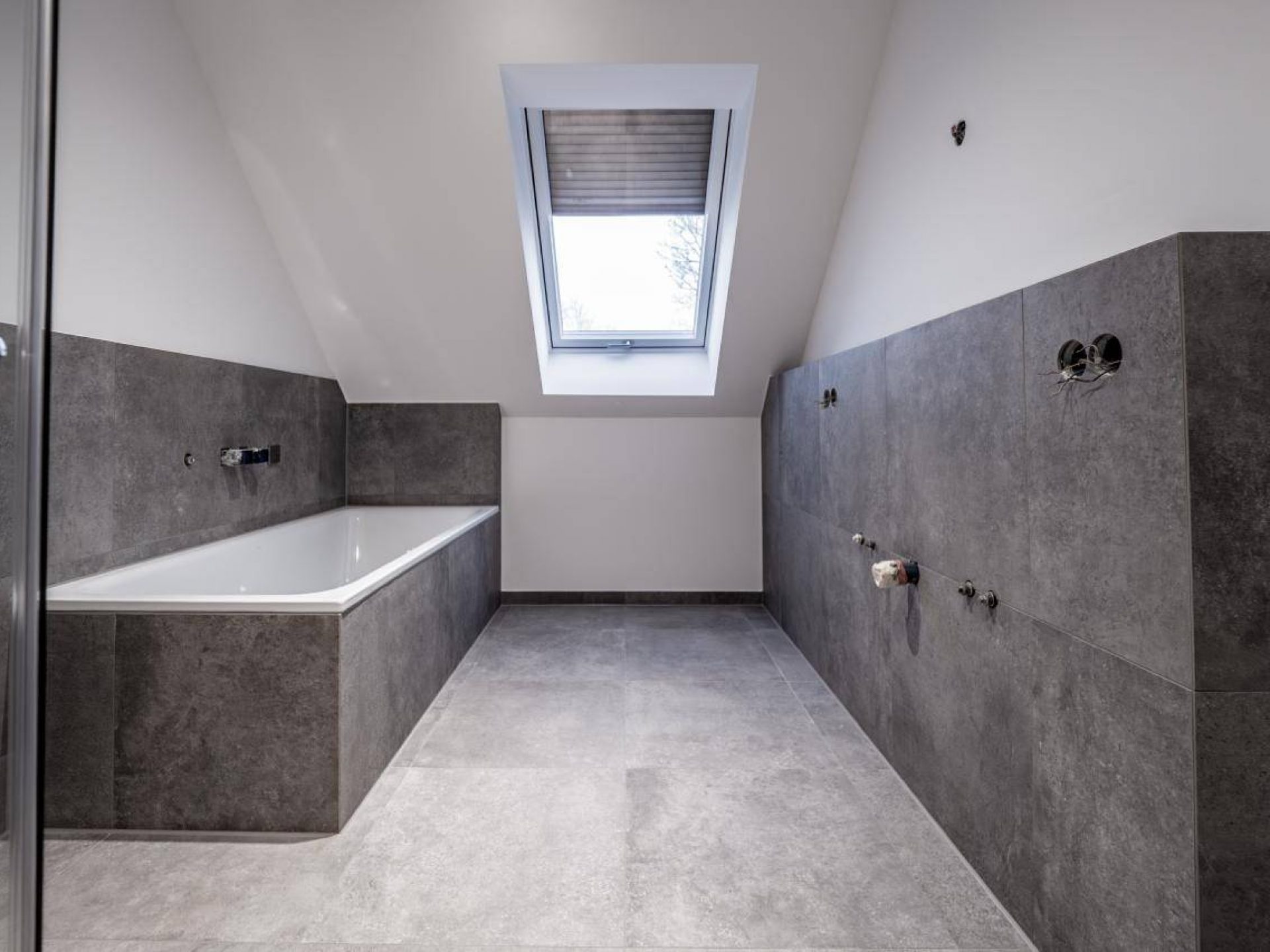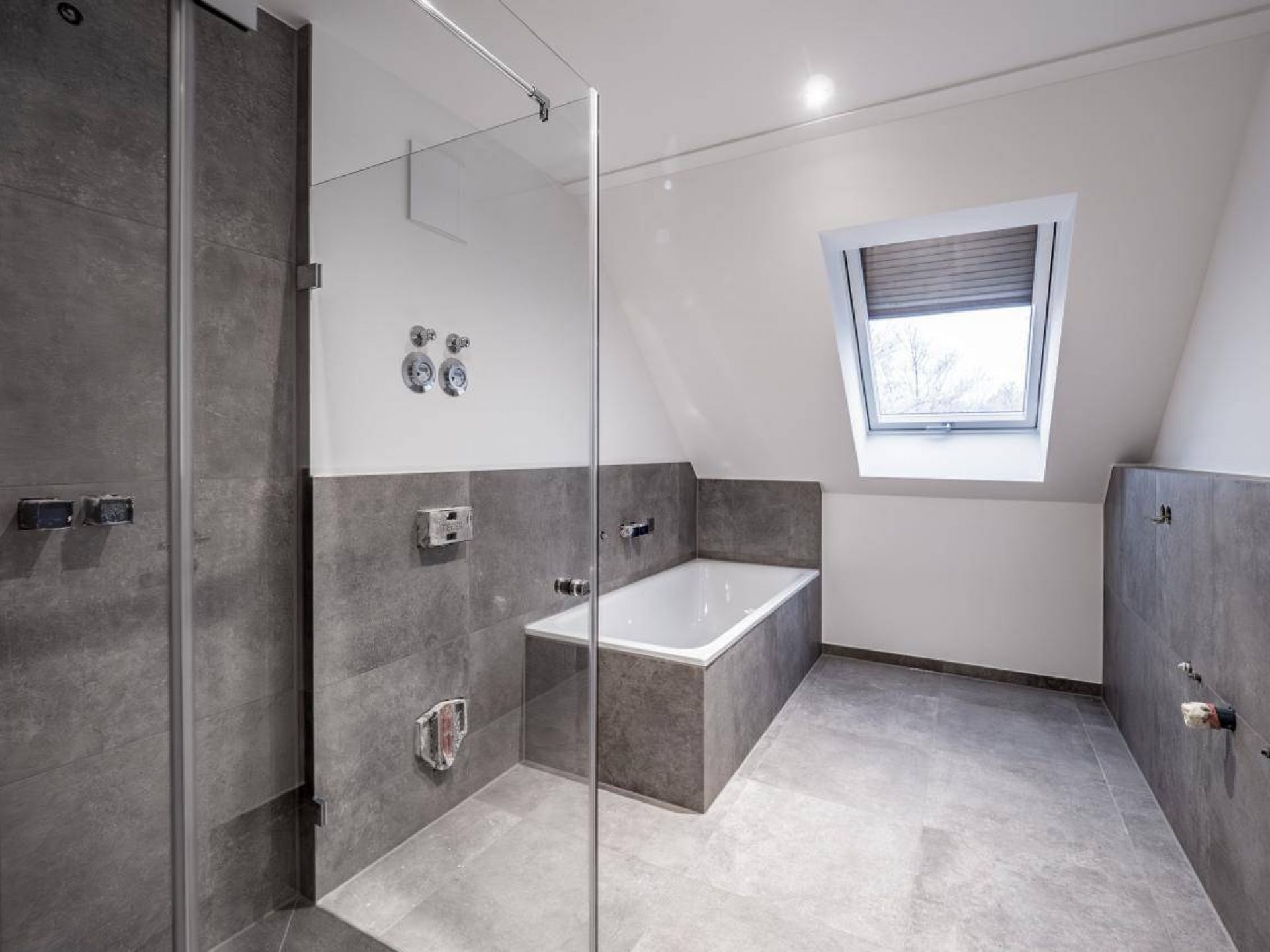 -großes Badezimmer modern gefliest mit Doppelwaschtisch, bodengleicher Glasdusche, Badewanne, WC und großem Dachflächenfenster